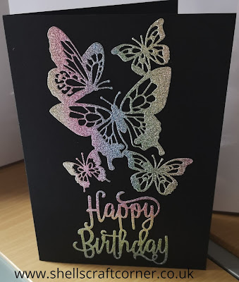 I got this lovely new rainbow glitter card and thought this would be great for Butterflys so I got my Butterfly dies out and this is my first card I die cut the Butterfly just one layer and the Happy Birthday . I think it really pops on the black card.